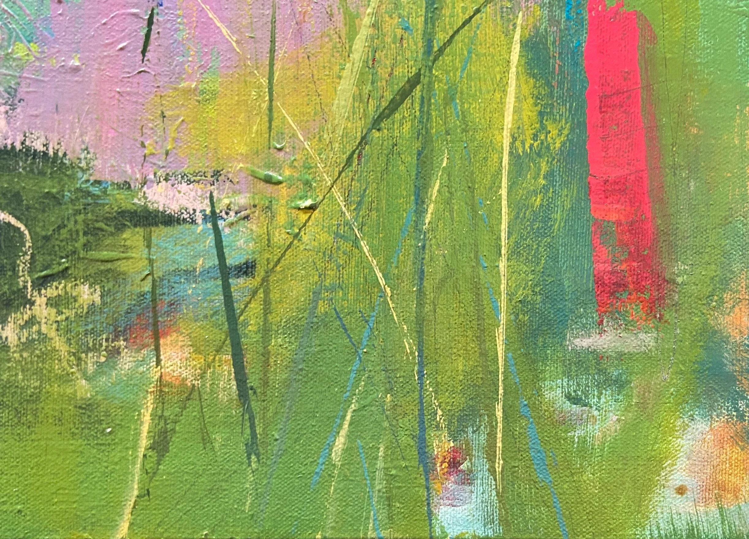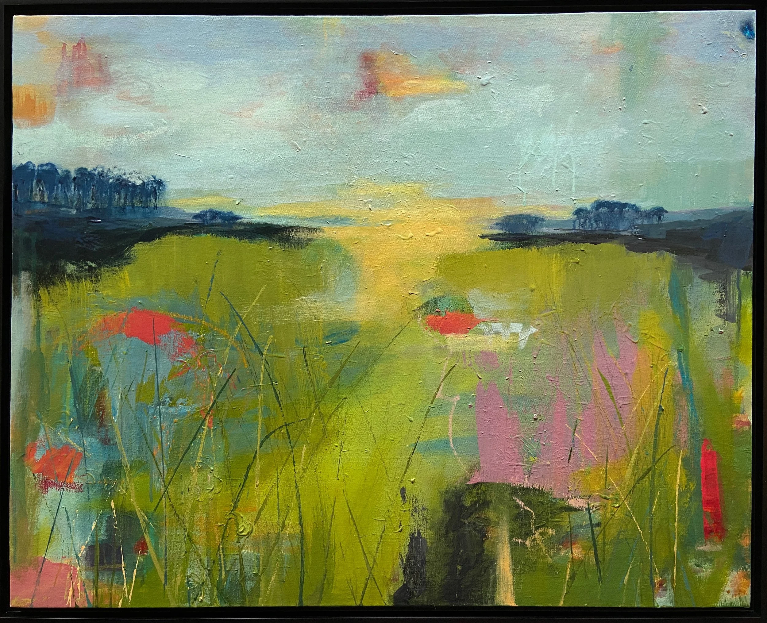 West of the Fields is acrylic on stretched canvas. It is 24X30 in a black, floating frame ready to hang.